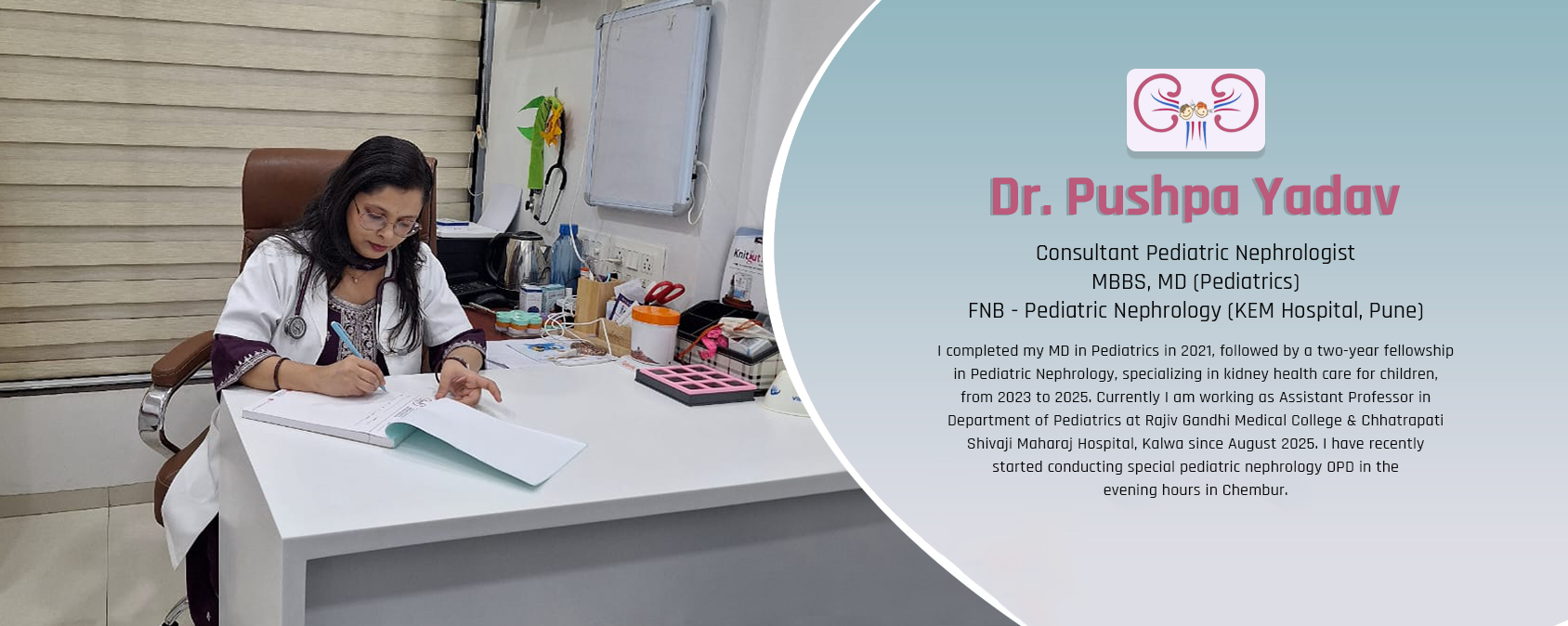 I completed my MD in Pediatrics in 2021, followed by a two-year fellowship in Pediatric Nephrology, specializing in kidney health care for children, from 2023 to 2025. Currently I am working as Assistant Professor in Department of Pediatrics at Rajiv Gandhi Medical College & Chhatrapati Shivaji Maharaj Hospital, Kalwa since August 2025. I have recently started conducting special pediatric nephrology OPD in the evening hours in Chembur.