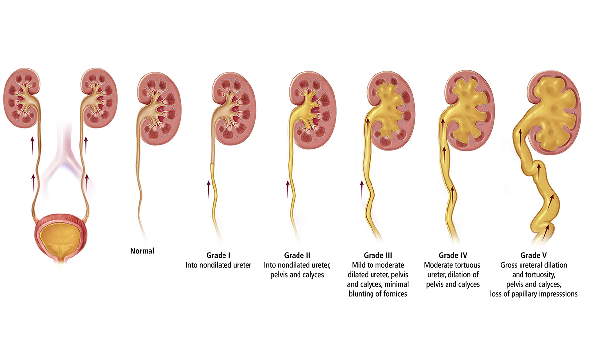 VUR is graded from I to V based on severity. Lower grades (I–III) often improve with age as the urinary system grows and the valve mechanism strengthens. Higher grades (IV–V) are less likely to resolve and may need medical or surgical management.